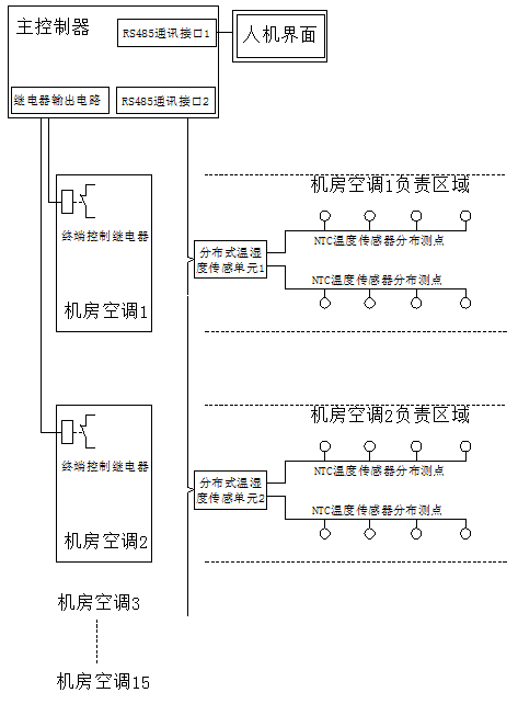 系統(tǒng)組成:系統(tǒng)控制柜(含主控制器,人機界面等),網(wǎng)絡(luò)傳感器節(jié)點單元,終端空調(diào)控制繼電器。